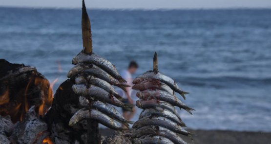 - "Espetos de sardinas" (sardines skewers being prepared in the typical way, right on the beach)